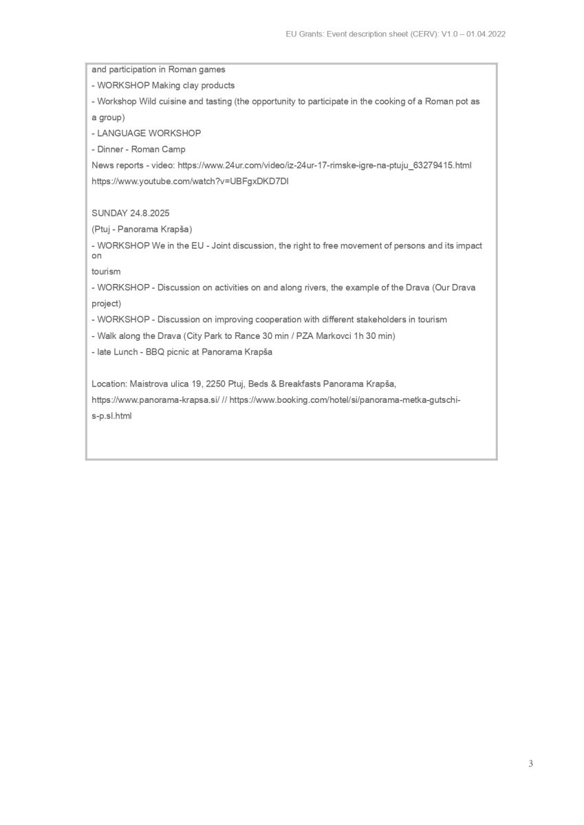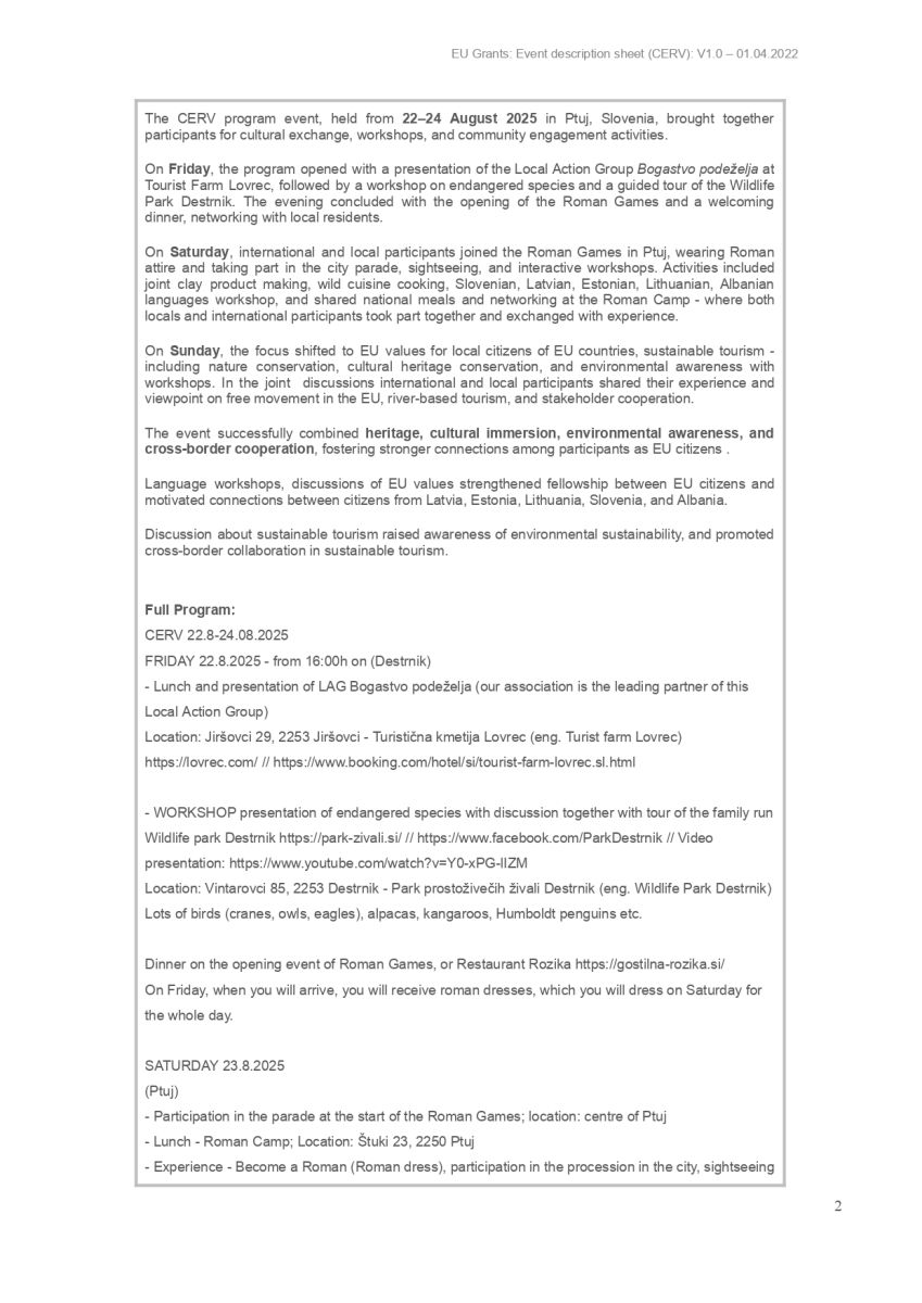 Participants took part in the Roman Games, marching in a joint parade in Roman costumes, attending traditional workshops, and watching gladiatorial fights. They also visited local enterprises, including Wildlife Park Destrnik, Turistična kmetija Lovrec, and Panorama Krapša, engaging in discussions with entrepreneurs about tourism development and the challenges and opportunities of entrepreneurship in protected areas.