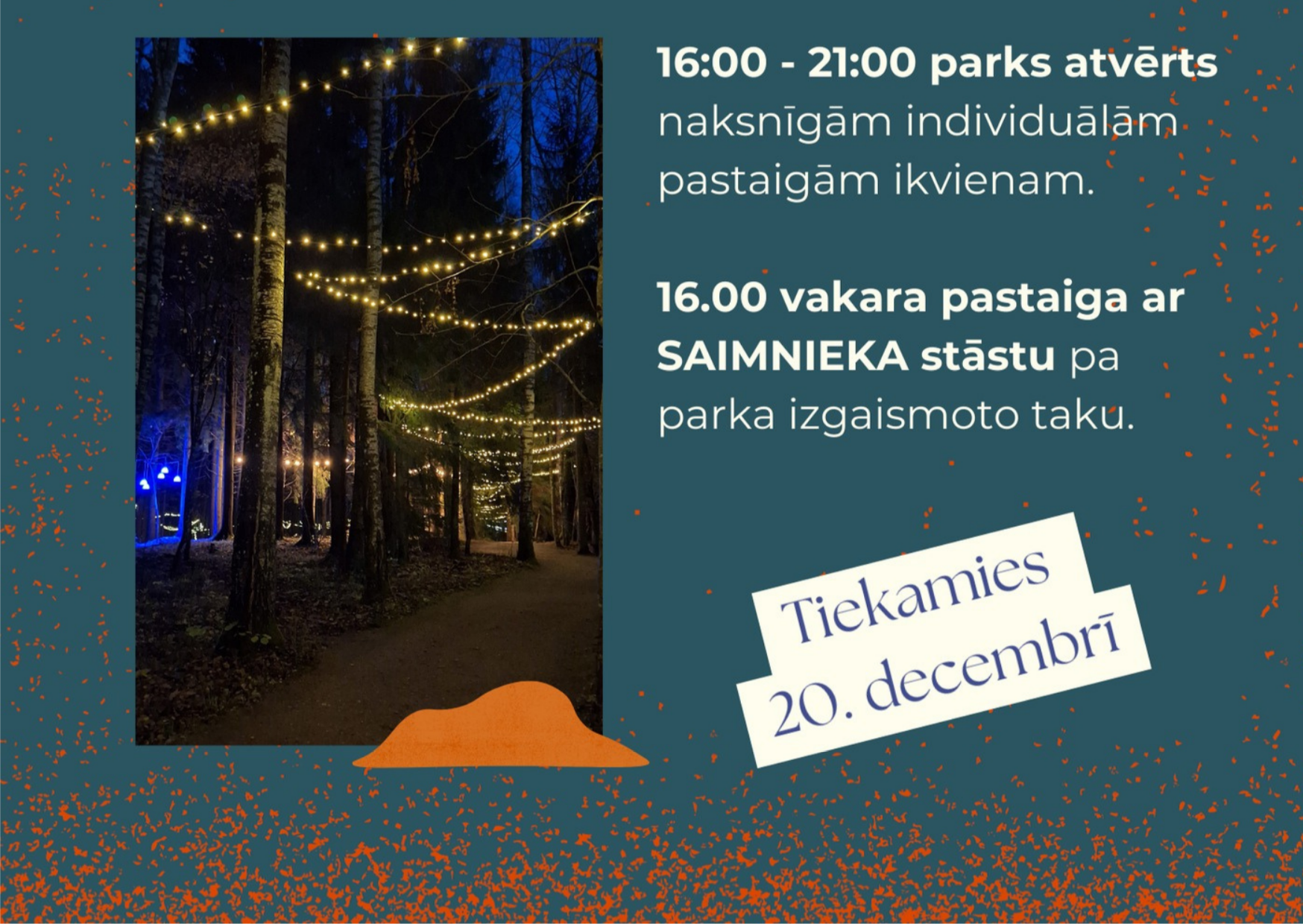 Parks būs atvērts naksnīgām individuālām pastaigām, ļaujot baudīt mieru, gaismiņas un ziemas noskaņu savā tempā.