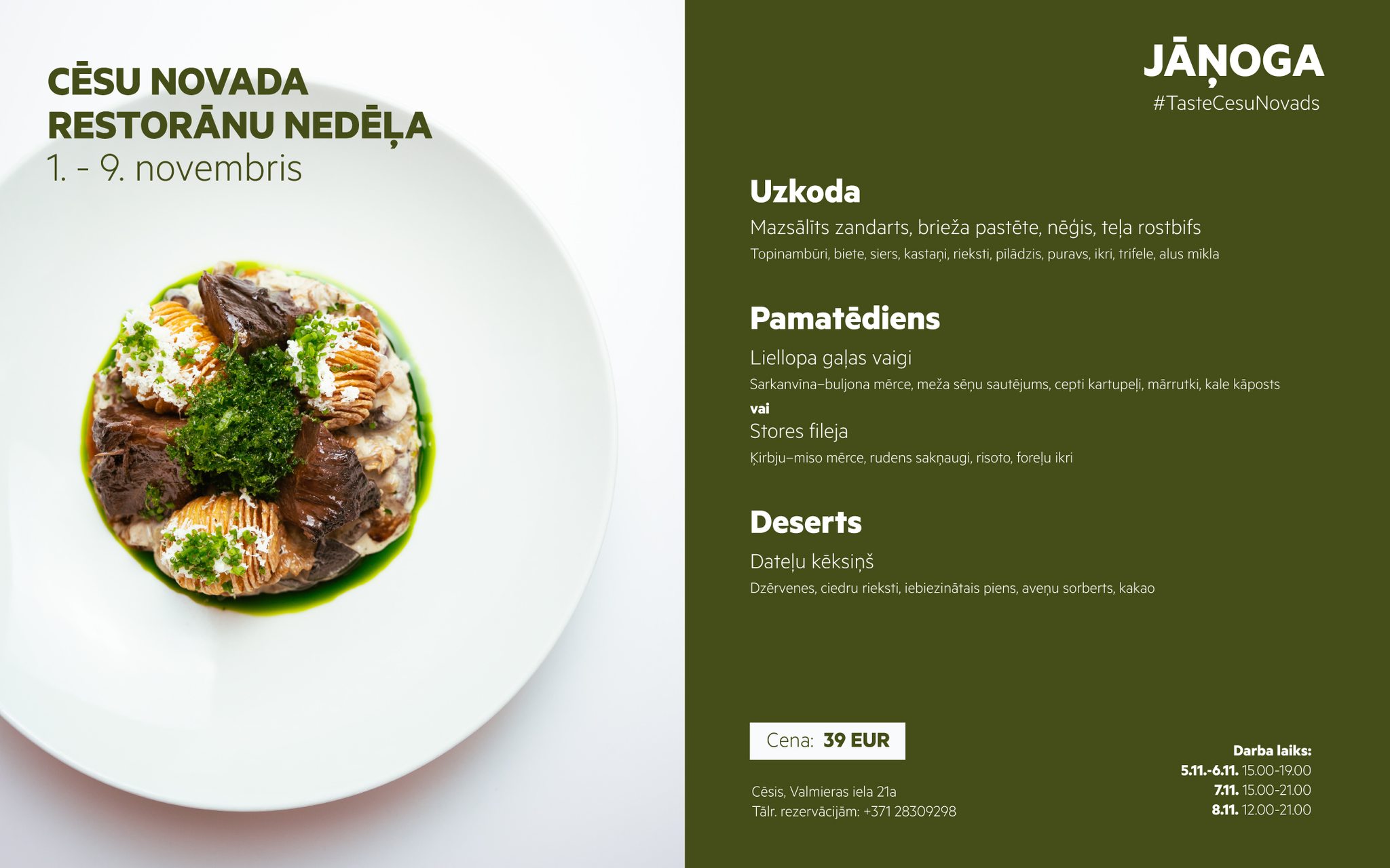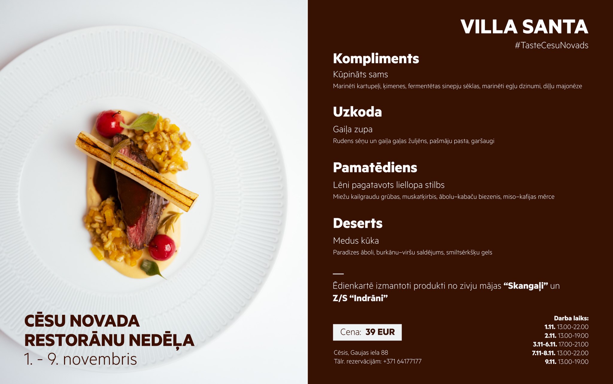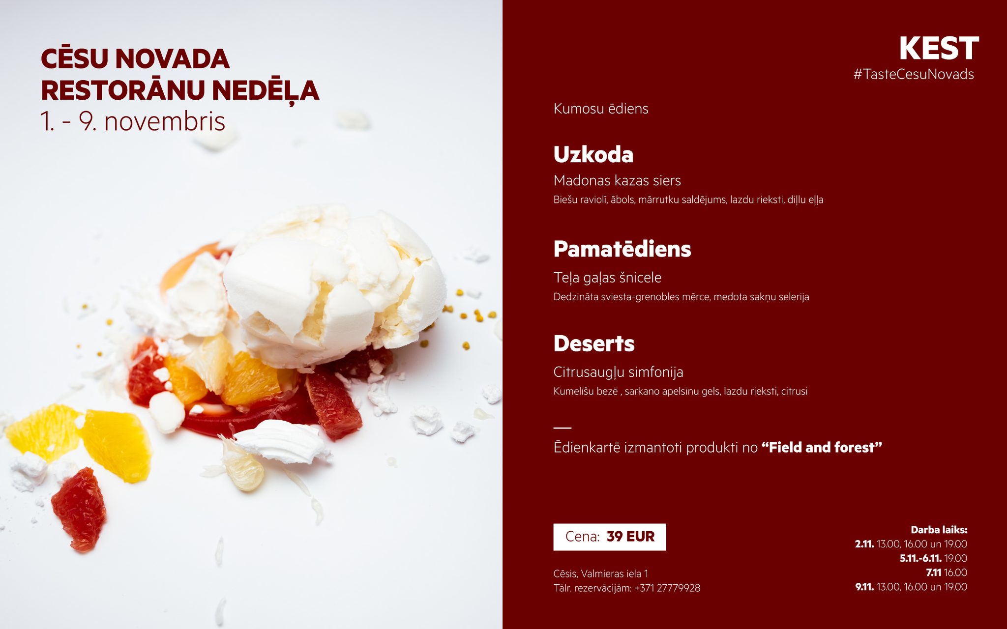 Deviņi izsmalcināti restorāni – H.E. Vanadziņš. Ziemeļu restorāns, Jāņoga, Kārļamuiža, KEST, Mango Sky Lounge, Villa Santa, Korean BBQ King Julian, Pavāru māja un Restorāns 1815, ir radījuši unikālas vairāku kārtu maltītes par vienotu cenu: 39 EUR personai. Restorānu nedēļas piedāvājumu restorāni ir izstrādājuši, sadarbojoties ar “Radīts Cēsu novadā” preču zīmes lietotājiem un vietējiem novada uzņēmējiem. Uz šķīvja baudīt varēs ne tikai estētiski skaistu maltīti, bet arī stāstus par novada raksturu un garšām.