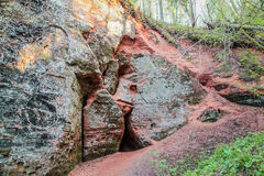 Lateral ravine of the left bank of Vējupīte Ravine with up to 11 m high and impressive sandstone cliffs at the feet of which a dark „mouth“ is seen – the Kraukļu Cave.