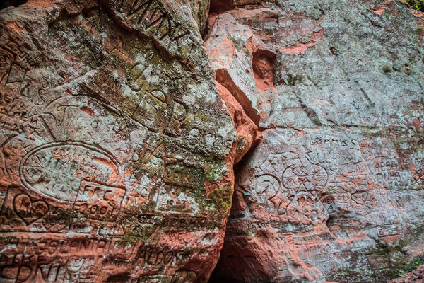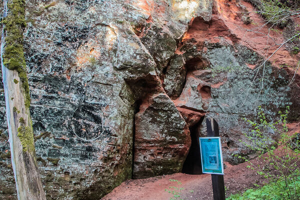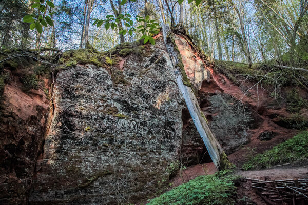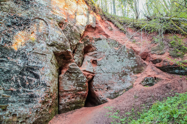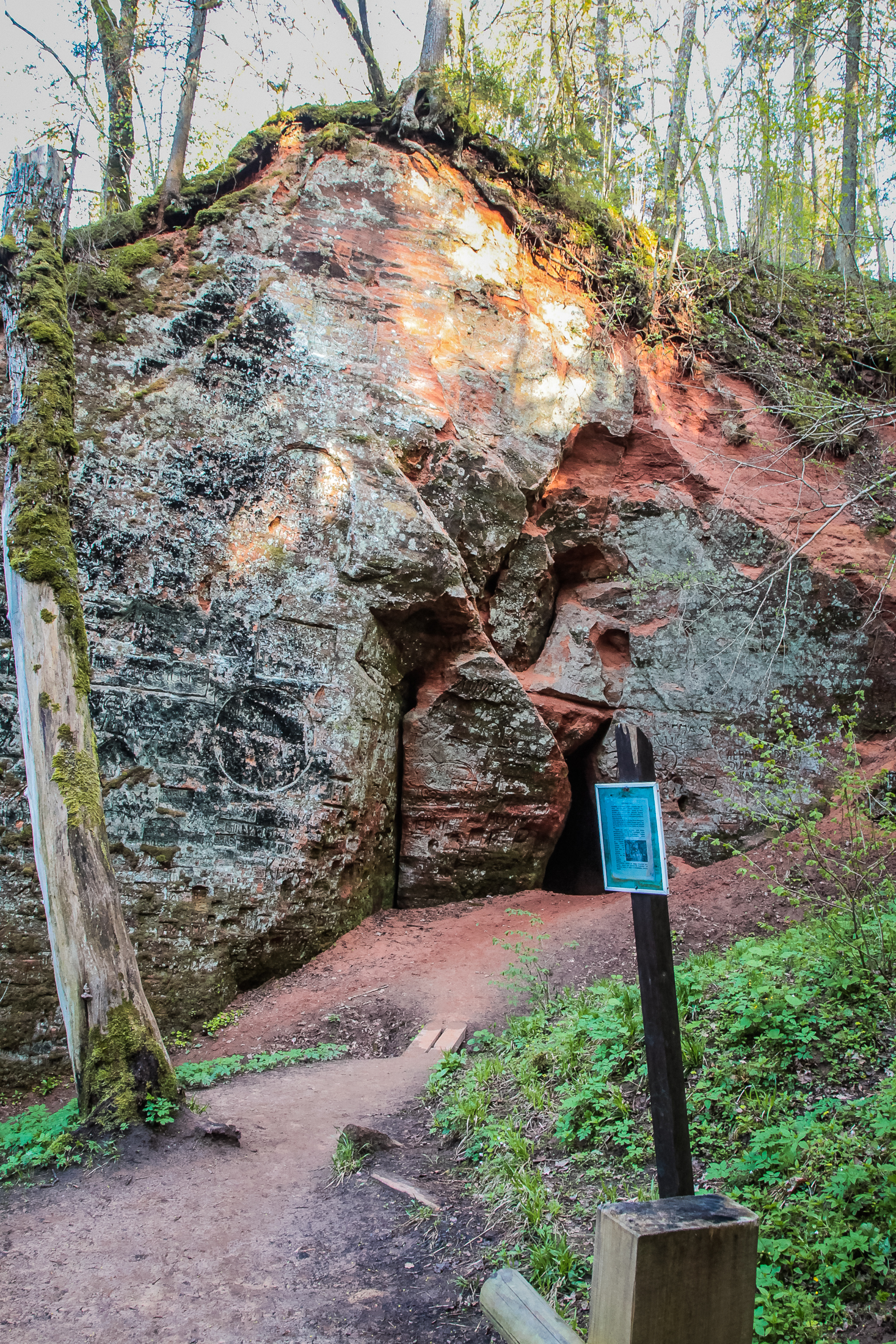 The 5.2 m long cave is formed in the reddish sandstone from Gauja suite. There is a legend related to the site that a kind foreman at the manor had helped serfs. The mastor of the manor had therefore pushed him off the cliff. Cries by the ravens had pointed to the place where he died.