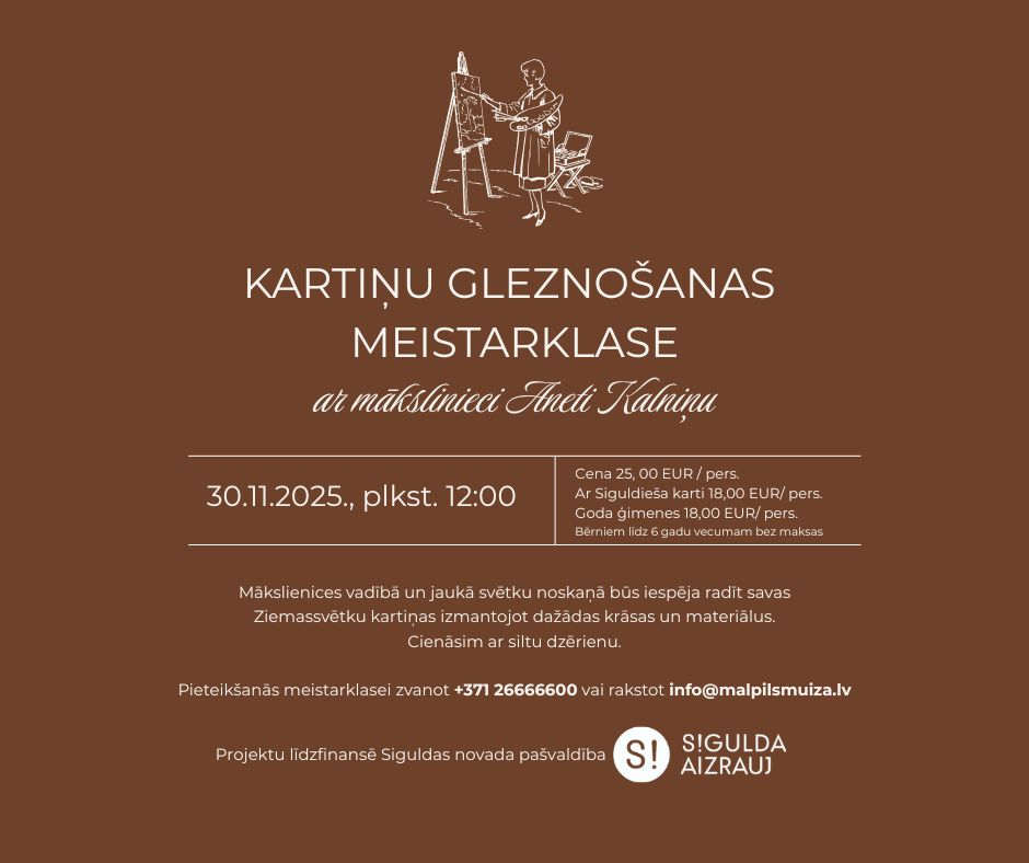 Pieteikšanās +371 26666600 vai info@malpilsmuiza.lv