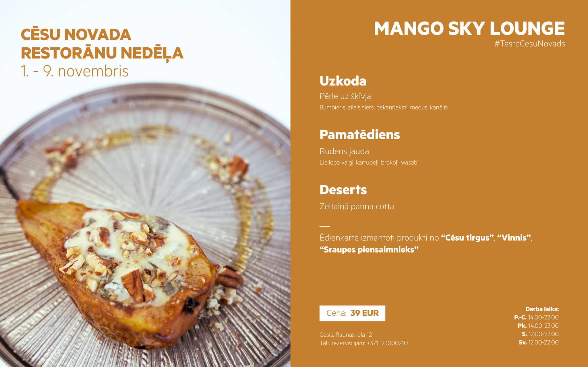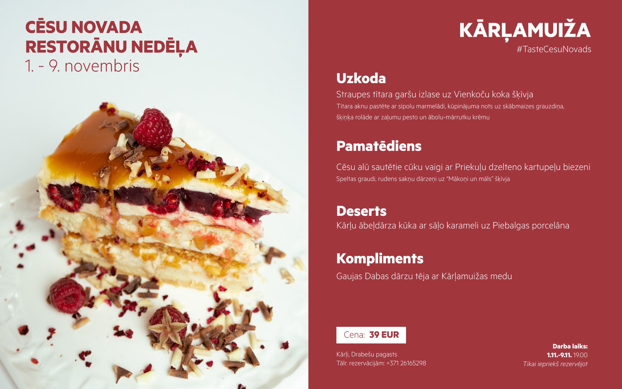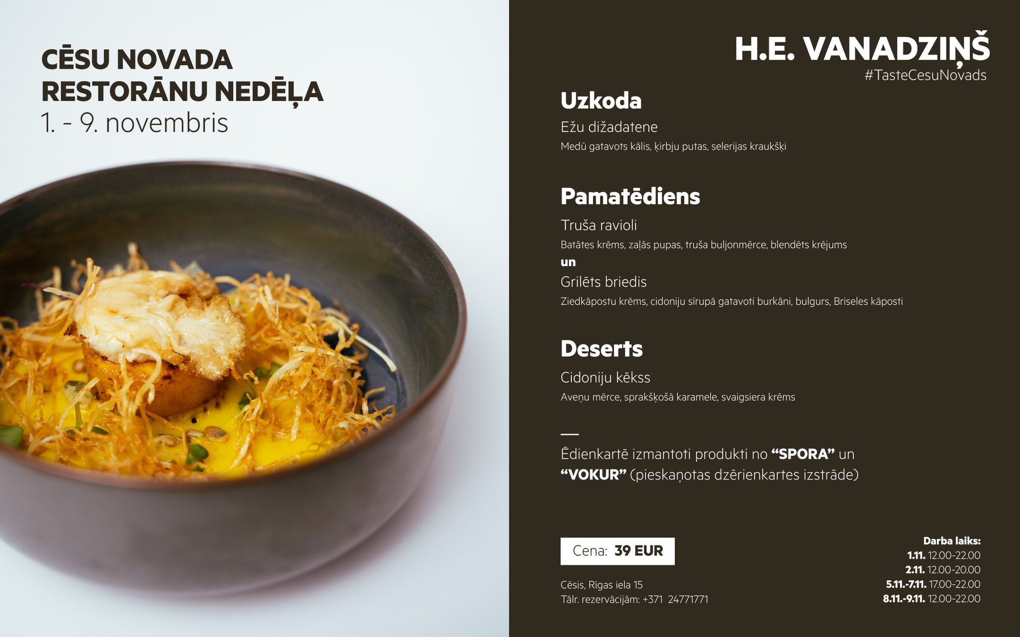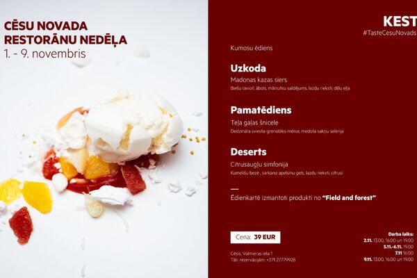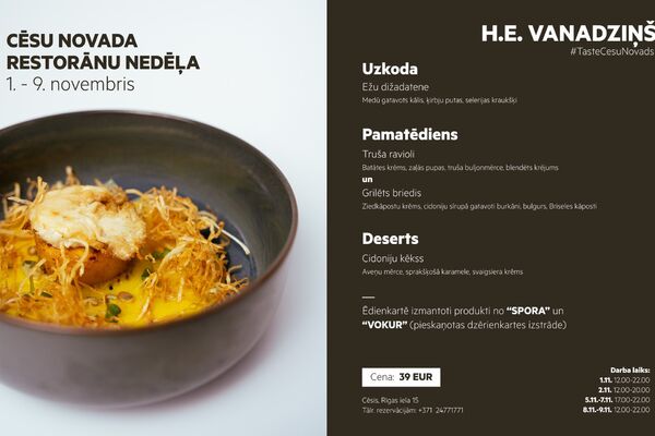 Deviņi izsmalcināti restorāni – H.E. Vanadziņš. Ziemeļu restorāns, Jāņoga, Kārļamuiža, KEST, Mango Sky Lounge, Villa Santa, Korean BBQ King Julian, Pavāru māja un Restorāns 1815, ir radījuši unikālas vairāku kārtu maltītes par vienotu cenu: 39 EUR personai. Restorānu nedēļas piedāvājumu restorāni ir izstrādājuši, sadarbojoties ar “Radīts Cēsu novadā” preču zīmes lietotājiem un vietējiem novada uzņēmējiem. Uz šķīvja baudīt varēs ne tikai estētiski skaistu maltīti, bet arī stāstus par novada raksturu un garšām.