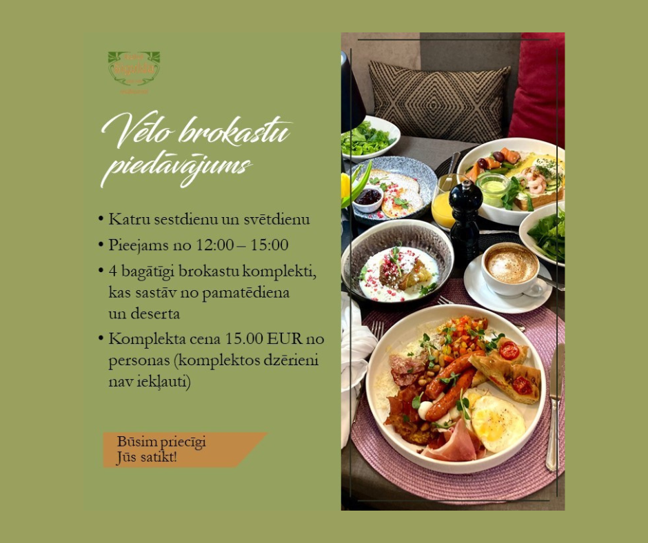 Tās piedāvājam 4 bagātīgu brokastu komplektu veidā – komplekts sastāv no pamatēdiena un deserta. Katra komplekta cena 15.00 EUR no personas (komplektos dzērieni nav iekļauti). Vēlo brokastu laikā pieejama arī ikdienas ēdienkarte un dzērienu karte.
