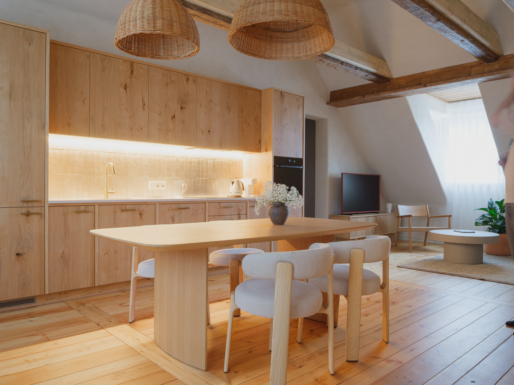 Šis nams apvieno vēsturisku mieru ar mūsdienīgu komfortu, piedāvājot elegantus un mājīgus apartamentus, kuros viegli iejusties. Interjers ir atturīgs, silts un pārdomāts - dabīgi materiāli, mierīgi toņi un detaļas, kas netraucē, bet papildina. No rīta šeit var baudīt klusumu un gaismu, bet dienā doties izzināt pilsētu, kas sākas tieši aiz durvīm. Mācītāja māja ir ideāli piemērota tiem, kas vēlas būt notikumu centrā, vienlaikus saglabājot privātumu un mieru.